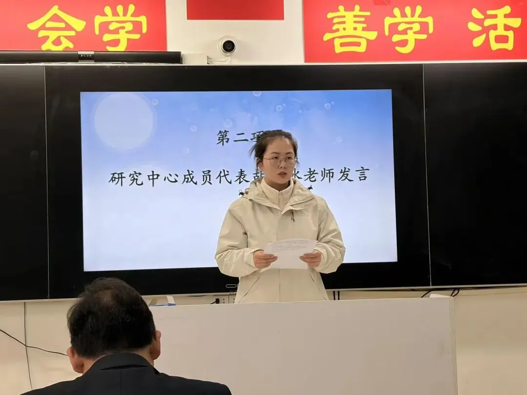 研究中心成员代表胡冰冰老师发言,称平台是教师业务练兵与理念革新的契机。她代表全体教师表态,将以归零心态、攻坚姿态投身研究,当好命题深耕者、资源筑路人、课堂实干家,通力合作完成研究任务,助力学校高考再创辉煌。