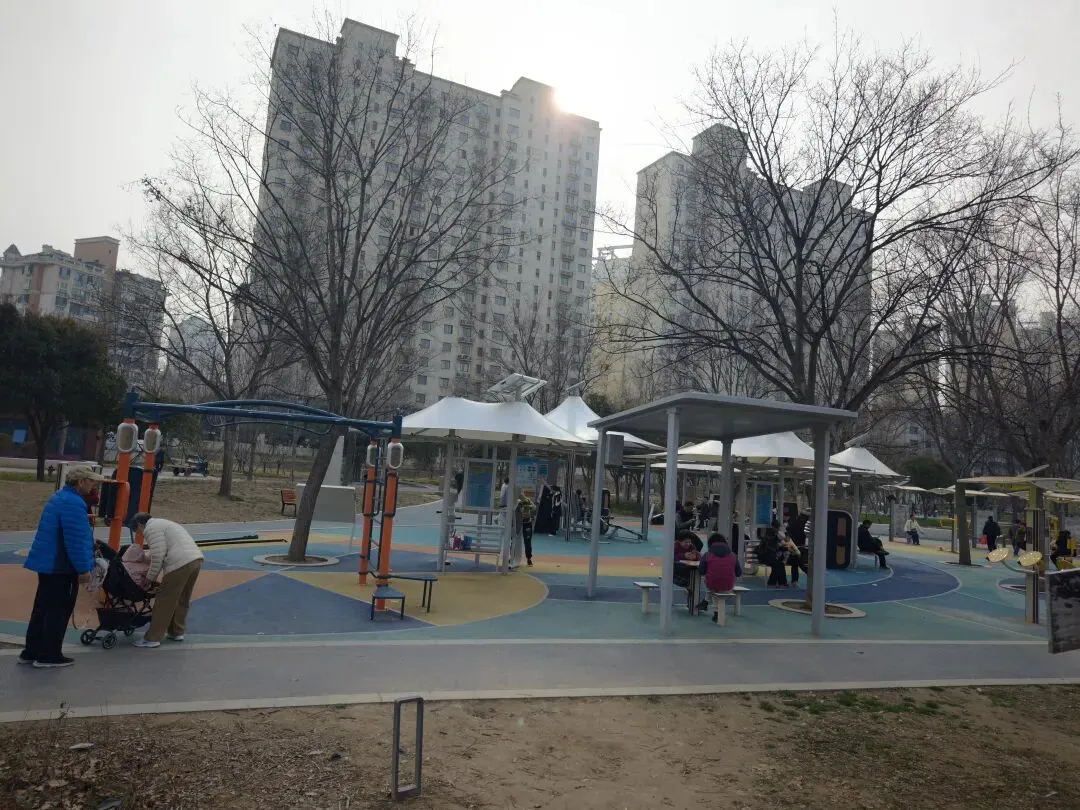 夕阳西下,金色的阳光洒在草坪上,孩子们在健身区疯跑,老人在长椅上唠嗑,年轻人沿着彩色跑道慢跑,情侣在樱花树下拍照📸