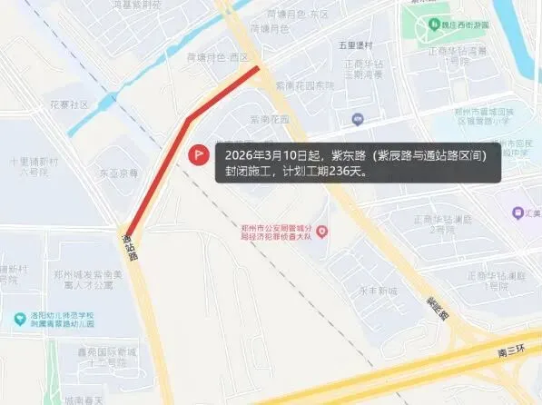 根据新建郑州南站及相关工程跨紫东路项目施工需求,紫东路(紫辰路与通站路区间)从2026年3月10日开始进行施工,工期236天,郑州交警提醒过往行人、车辆减速慢行。