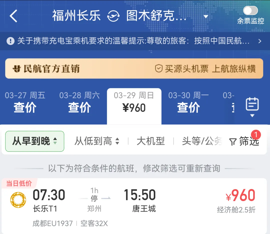 福州长乐07:30起飞→09:50到达郑州