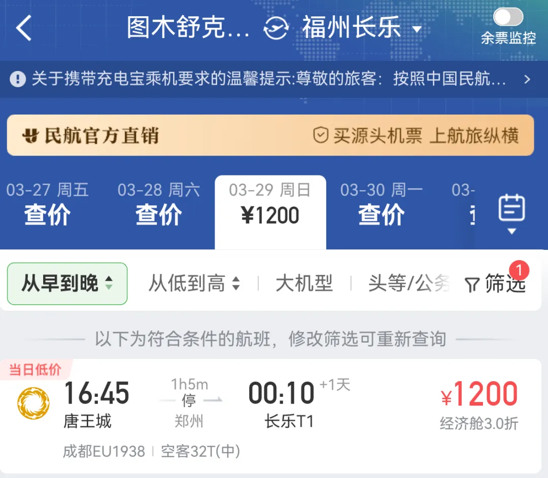 →22:05起飞→次日00:10抵达福州长乐