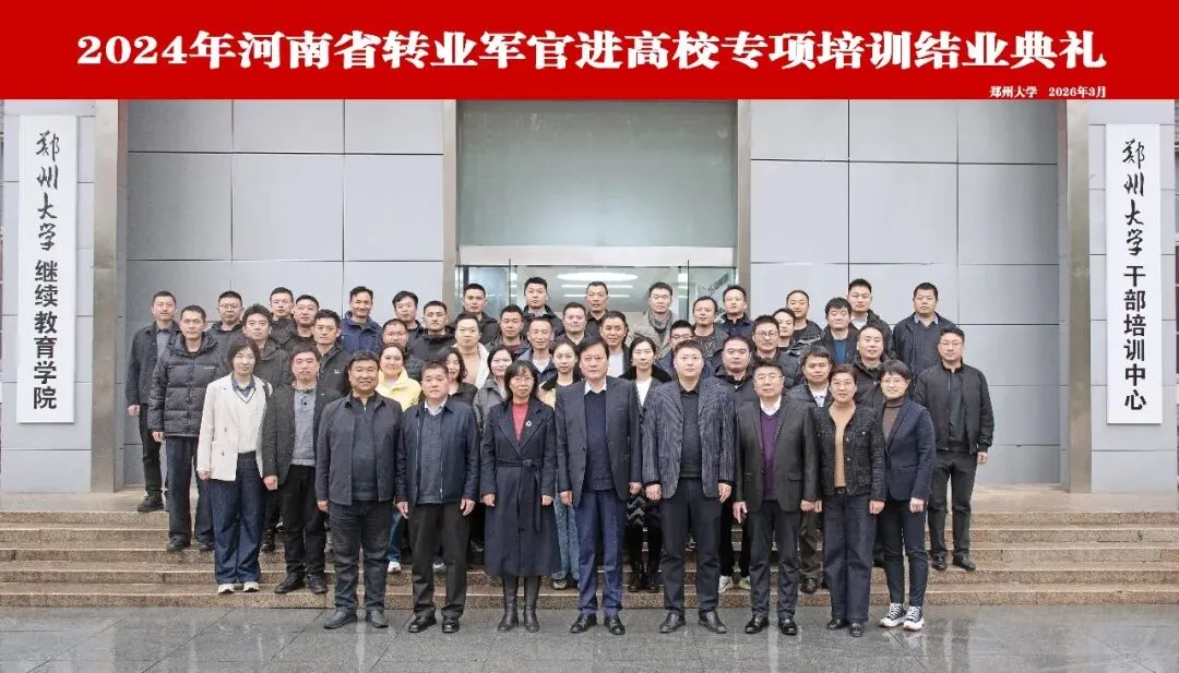 3月17日下午,2024年河南省转业军官进高校专项培训结业典礼在郑州大学南校区教三楼举行。郑州大学继续教育学院党委书记何玲玲,继续教育学院院长、党委副书记、干部培训中心主任张洪剑,党委副书记、纪委书记朱奎,党委副书记王志新,副院长、副主任徐春华、王晓川出席典礼,郑州大学军转干部学院办公室主要负责同志和42名学员参加典礼。典礼由副院长、副主任崔波主持。