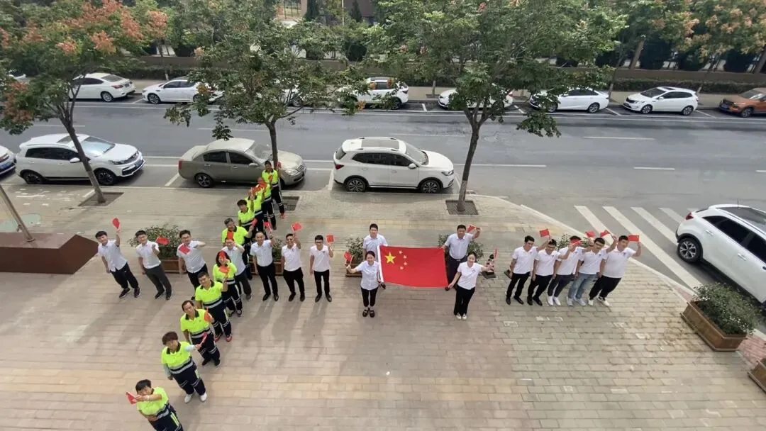 与国旗同框,向祖国表白。支部党员干部群众统一着装,党员佩戴党员徽章,于公司一楼门口国旗下排成“十一”队形,手里挥动着鲜艳的小红旗,一句句“众城告白祖国 庆祝祖国华诞”等祝福语回荡在五星红旗周围,“公用·众城人”用自己的真挚祝福深情告白祖国,爱国赤子之情溢于言表,共同欢庆祖国73周年华诞。