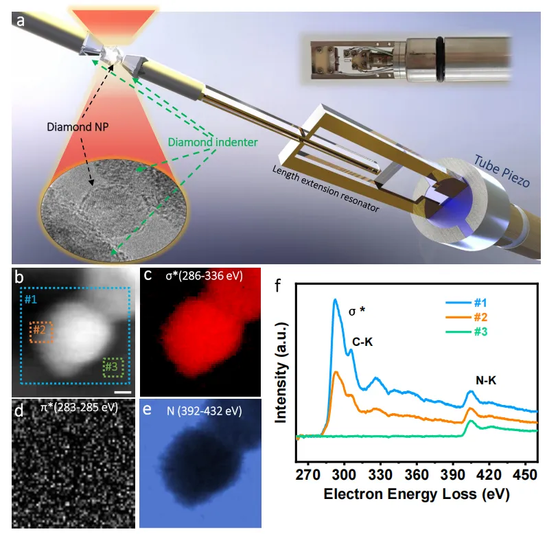 金刚石的“脆性”特性一直是其应用的瓶颈,尤其是在高应力条件下,金刚石容易发生断裂而不能发生塑性变形。在这项研究中,研究团队采用了一种定制的原位透射电子显微镜(TEM)纳米力学加载装置,进行纳米金刚石颗粒的压缩应力实验,并实时观察其结构变化。