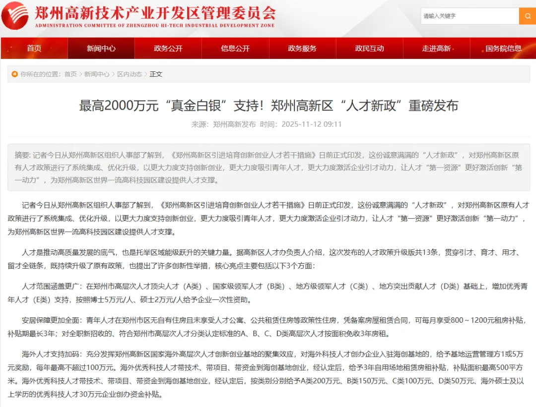 2025年,高新区印发《郑州高新区引进培育创新创业人才若干措施》,通过13条诚意满满的举措,贯穿引才、育才、用才、留才全链条。