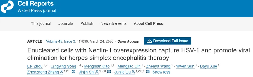 2026年3月12日,郑州大学刘军杰、史进进、张振中共同通讯在Cell Reports 在线发表题为“Enucleated cells with Nectin-1 overexpression capture HSV-1 and promote viral elimination for herpes simplex encephalitis therapy”的研究论文。受病毒通过识别宿主细胞表面的nectin‑1入侵细胞的机制启发,本研究构建了高表达nectin‑1的去核间充质干细胞(eMSCs),作为“诱饵细胞”捕获HSV‑1。