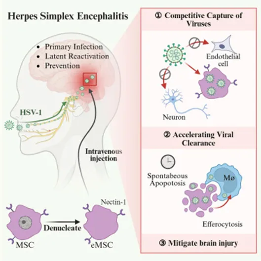 Nectin-1,是一种免疫球蛋白超家族的跨膜糖蛋白,是HSV-1的关键进入受体,能结合病毒糖蛋白D并介导膜融合。虽然HSV-1也可以利用疱疹病毒进入介质(HVEM)和3-O-硫酸肝素硫酸盐(3-OSHS)等受体,但既往研究表明,当这些受体单独过表达时,病毒入侵与nectin‑1表达水平的相关性最强。病毒与受体结合后,含基因组的病毒衣壳沿微管转运至细胞核内,HSV‑1DNA基因组在此完成复制与扩散。基于这一机制,研究提出假说:高表达nectin‑1的细胞可作为“诱饵”捕获病毒,并通过预先去除细胞核来阻止病毒复制与扩散。本研究结果显示,高表达nectin‑1的去核间充质干细胞(eMSCs)可在神经元存在的条件下有效捕获病毒,并因预先去核而抑制病毒复制与传播。有趣的是,由于缺乏细胞核,捕获病毒后的eMSCs约在60小时后发生内源性凋亡,这一凋亡过程可特异性触发巨噬细胞的胞葬作用,从而加速体内HSV‑1的清除。在HSE原发性急性感染模型中,eMSCs表现出显著的病毒清除效果,并通过减轻脑部炎症保护宿主神经元;即使在生理性潜伏再激活模型中也同样有效。综上,该策略为难治性HSE提供了全新治疗思路,有效克服了现有HSV‑1治疗手段的局限。
