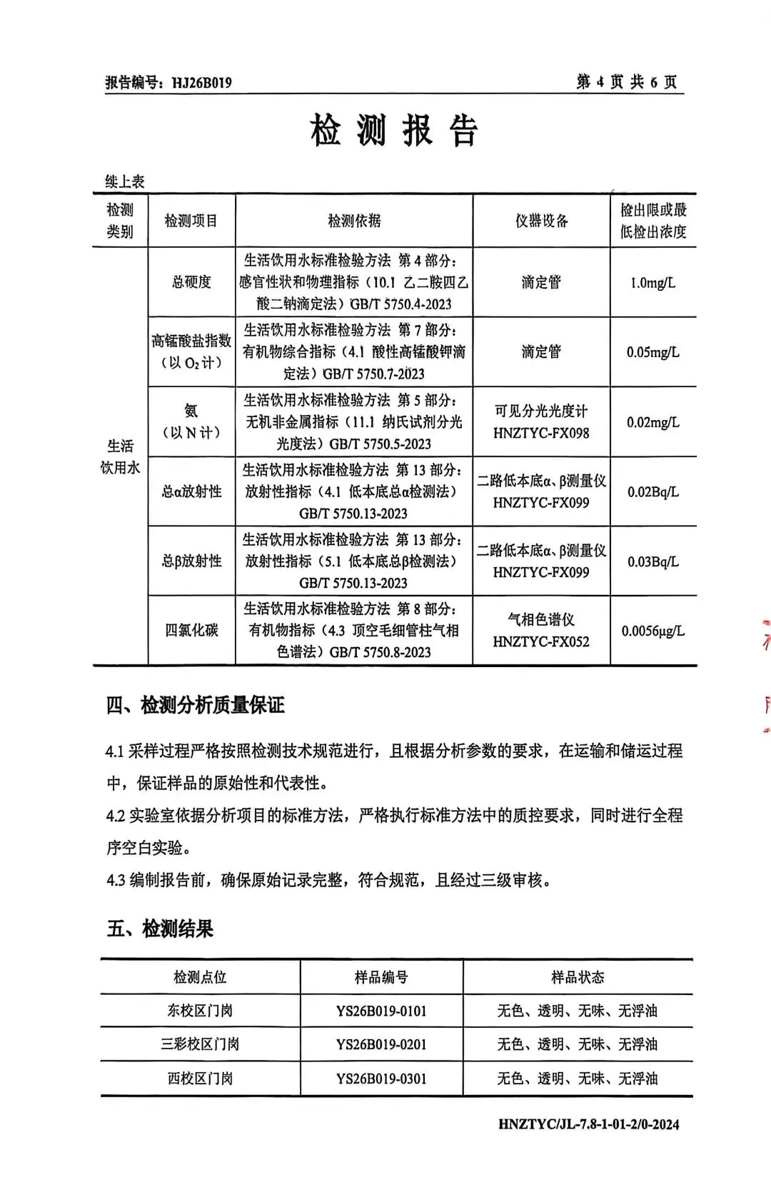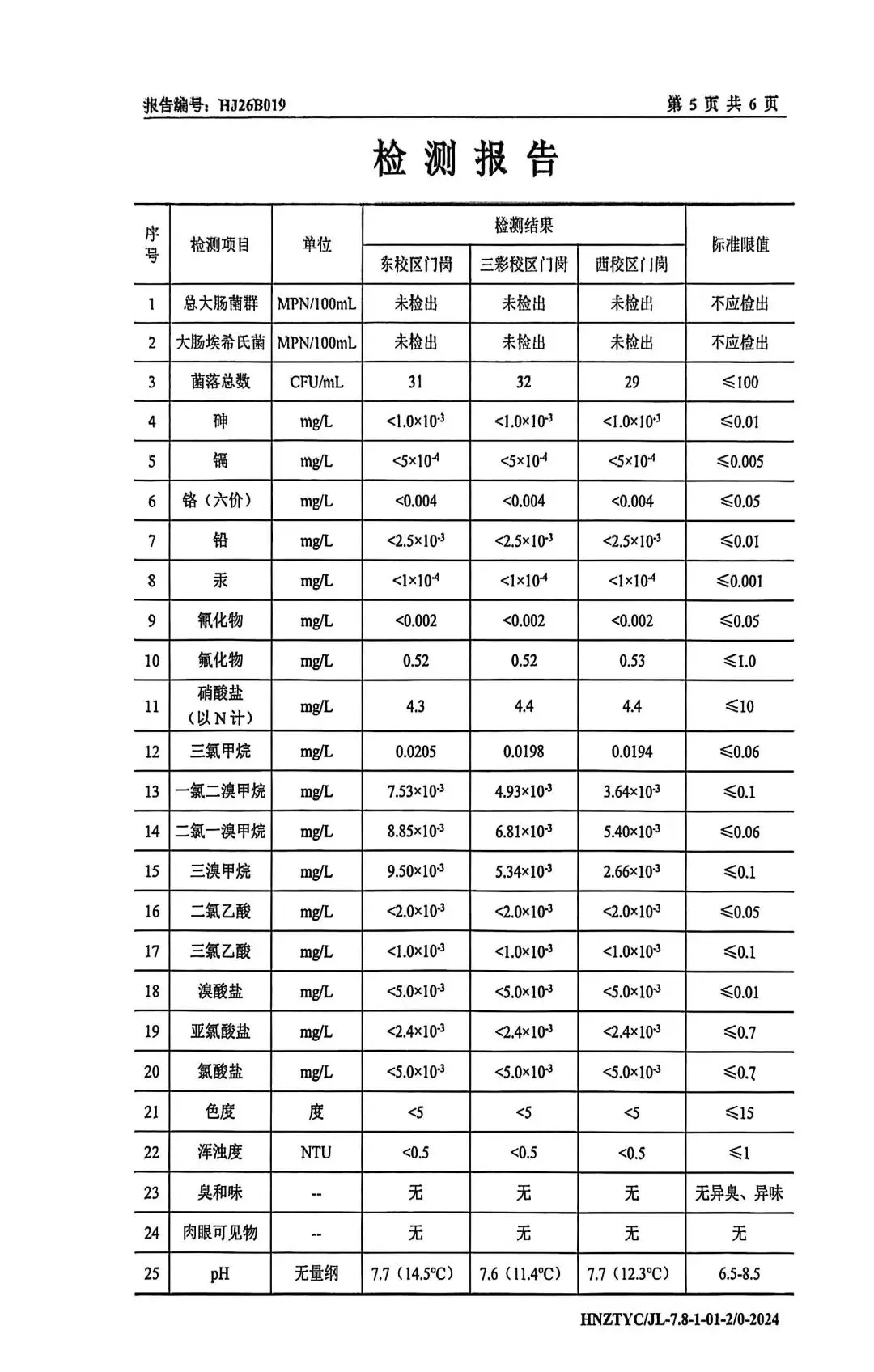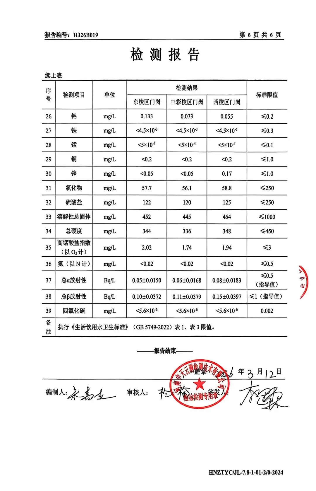2026年3月我校对“东校区门岗”、“三彩校区门岗”、“西校区门岗”生活饮用水进行了水质抽样检测,现将报告公示如下: