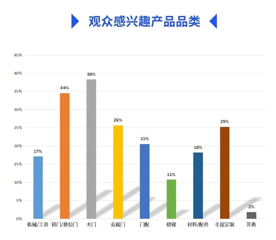 从观众反馈信息看,此次展会观众感兴趣的产品品类集中在木门、移门、全屋定制、金属门等领域,机械、门配锁具、配材辅料等品类关注度相较往届也有较大提升。