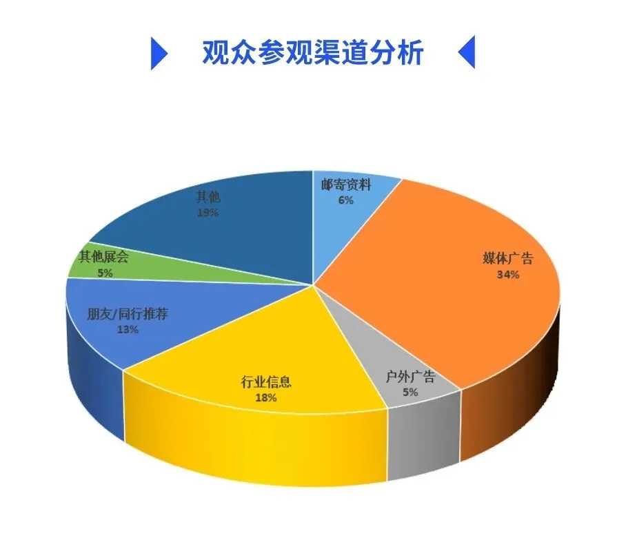 在此次展会的观展群体中,有34%的观众从媒体广告中获知观展信息,18%的观众从行业媒体处知悉展会信息,13%的观众受朋友/同行推荐来参观展会,还有16%的观众通过邮寄资料/户外广告/同类展会等途径了解展会信息。