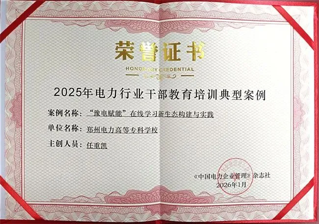 近日,中国电力企业管理杂志社正式印发《关于公布2025年度电力行业干部教育培训典型案例遴选结果的通知》(杂志〔2026〕1号),由郑州电力高等专科学校培训管理部报送的《“豫电赋能”在线学习新生态构建与实践》案例,经多轮评审成功入选“2025年度电力行业干部教育培训典型案例”,跻身全国57篇典型案例之列,充分彰显了郑州电力高等专科学校在电力行业干部教育培训领域的创新实践与突出成效。 本次案例征集活动由《中国电力教育》杂志组织开展,旨在总结推广电力行业干部教育培训先进经验。活动自2025年9月启动以来,吸引了全国电力企业、培训机构、高等院校等单位广泛参与,经过多轮严苛评审,最终确定典型案例名单。郑州电力高等专科学校凭借扎实的教培实践、鲜明的创新特色,从众多申报案例中脱颖而出。