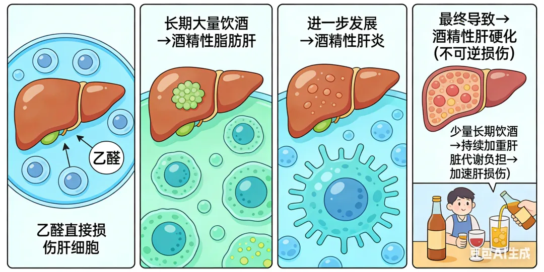 酒精的代谢产物乙醛会直接损伤肝细胞,长期大量饮酒,会先引发酒精性脂肪肝,再发展为酒精性肝炎,最终导致酒精性肝硬化——这个过程中,肝细胞的损伤多为不可逆。哪怕是少量长期饮酒,也会持续加重肝脏代谢负担,加速肝损伤。