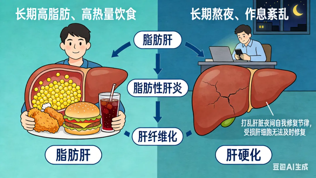 长期高脂肪、高热量饮食,会让脂肪在肝脏内大量堆积,引发脂肪肝,若放任不管,脂肪性肝炎会逐步发展为肝纤维化;而长期熬夜、作息紊乱,会打乱肝脏夜间的自我修复节律,让受损肝细胞无法及时修复,成为肝硬化的“助推器”。