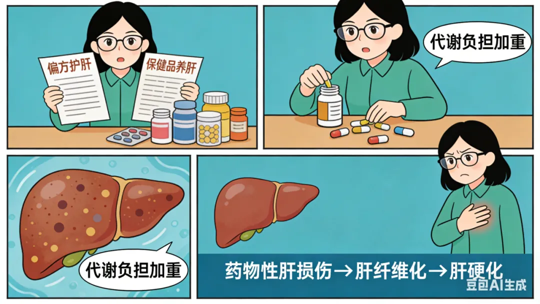很多人轻信“偏方护肝”“保健品养肝”,盲目服用不明成分的补药、养肝产品,甚至自行增减药物剂量。要知道,肝脏是人体主要的代谢器官,不明成分的物质会加重肝脏代谢负担,引发药物性肝损伤,若未及时发现,也会逐步发展为肝纤维化、肝硬化。
