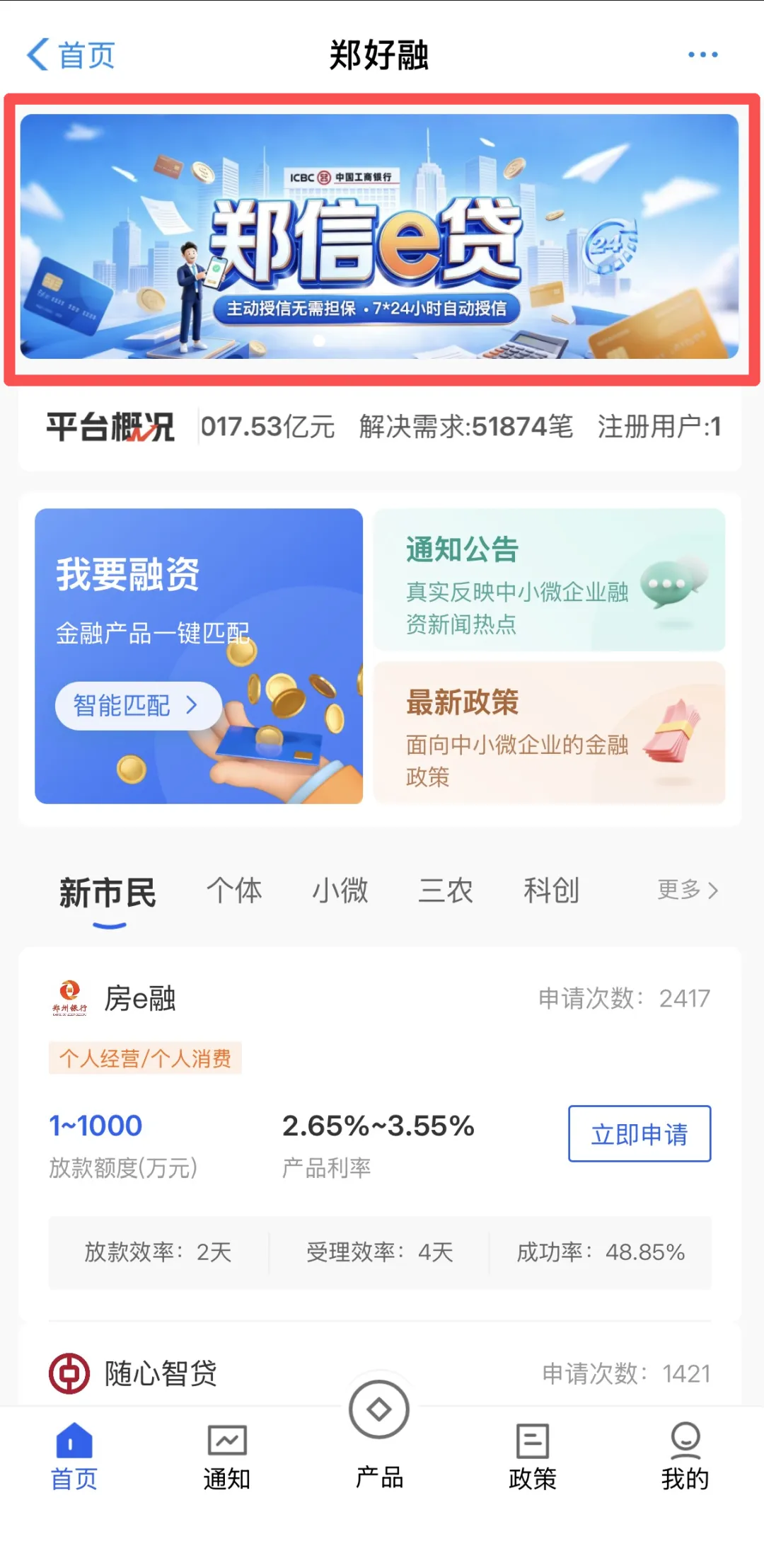 企业用户通过PC端(网址:https://www.zhenghaorong.com)或微信搜索“郑好融服务”公众号登录进入郑好融平台主页,点击首页“郑信e贷”宣传图,登录账号后即可查看产品详情并在线申请。