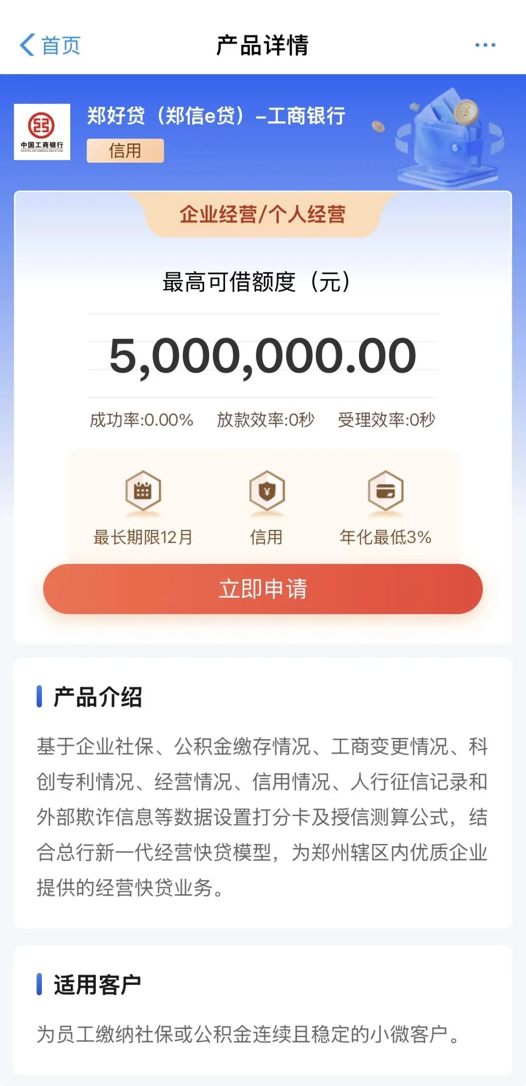 "郑信e贷"产品基于企业社保、公积金缴存情况、工商变更情况、科创专利情况、经营情况、信用情况、人行征信记录和外部欺诈信息等数据设置打分卡及授信测算公式,结合总行新一代经营快贷模型,为郑州辖区内优质企业提供的经营快贷业务。
