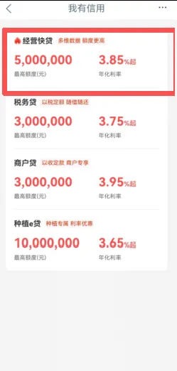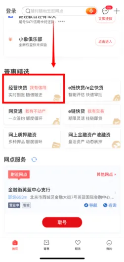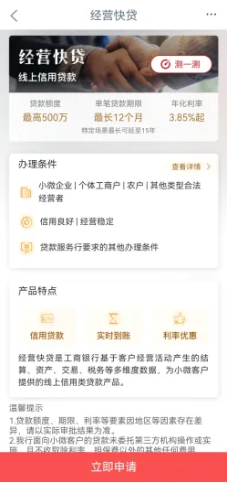 ①企业用户登录手机银行,进入“标准版”或“普惠版”。进入首页向下滑到“普惠精选”栏目,选择【经营贷款】,进入【产品列表】页面,在产品列表中选择【经营快贷】,点击进入产品详情页。