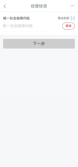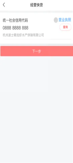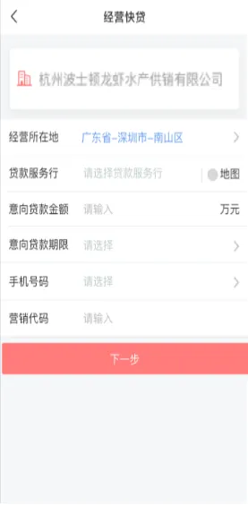 ③输入“统一社会信用代码”后点击【下一步】进入意向信息录入页面,录入“经营所在地”、“贷款服务行”、“意向贷款金额”等信息。提醒:若列表中展示的“手机号码”不是当前使用号码,请联系网点进行修改;“营销代码”为选填项。