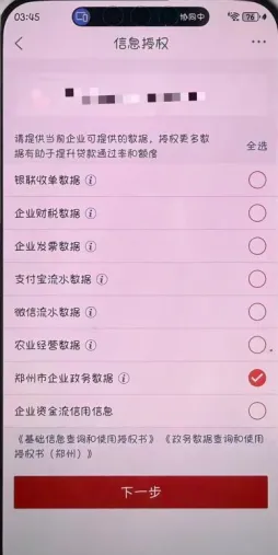 ④点击【下一步】,进入数据授权页,勾选“郑州市企业政务数据”选项后办理“郑信e贷”业务,勾选后点击【下一步】进入授权流程,用户阅读授权书并点击【我已阅读并同意相关内容】,进行短信验签后,提交申请成功。