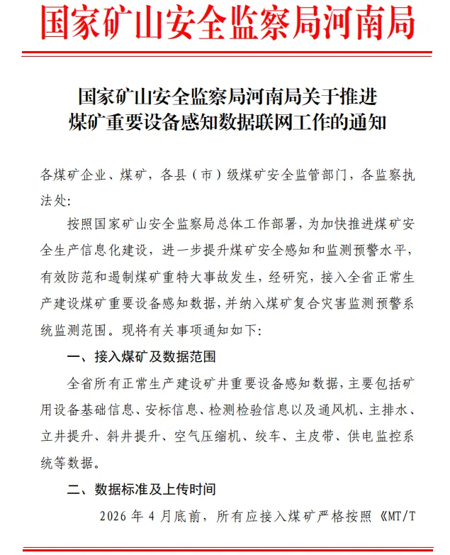 国家矿山安全监察局河南局明确要求:2026年4月底前,全省正常生产建设煤矿必须按《MT/T1201.2-2023》标准,完成重要设备感知数据联网上传,接入复合灾害监测预警系统。逾期未完成将面临通报、约谈,停产停建矿井恢复生产前必须先完成联网!