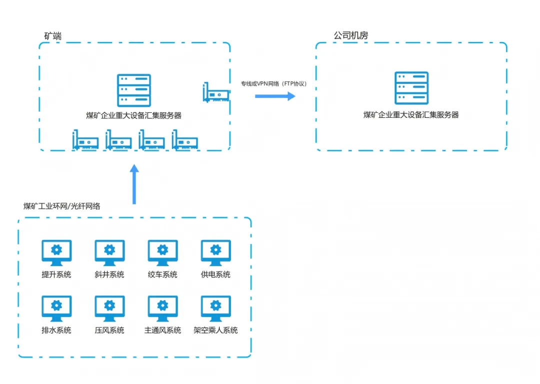 采用层级架构,根据现场实际情况依托煤矿工业环网或者光纤单线实现数据传输,底层为矿端各个子系统;中间层为煤矿企业重大设备汇聚服务器,负责数据汇聚;顶层为上级单位,煤矿与上级单位通过专网/VPN网络(FTP协议)完成数据上传。