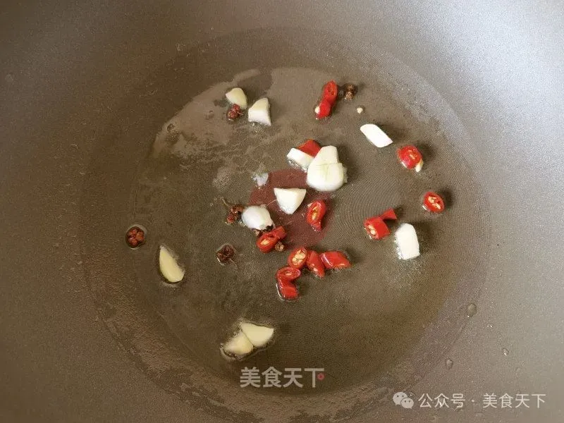 6. 锅里适量油烧热,姜蒜,花椒,小米椒炒香。