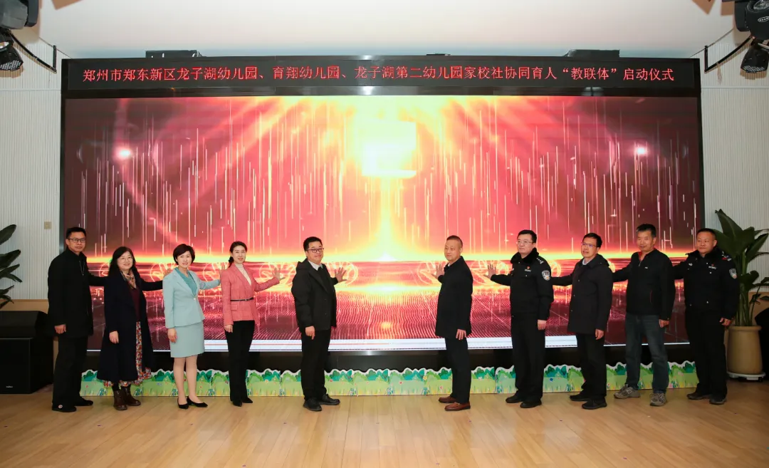 郑州市郑东新区龙子湖街道办事处、河南大学郑州校区、河南农业大学、河南财政金融学院、华北水利水电大学、河南财政金融学院、河南经贸职业学院、河南牧业经济学院、河南职业技术学院、河南省儿童医院、河南中医药大学第一附属医院龙子湖院区、河南省科技馆、郑东新区文化馆、郑州市公安局交警支队六大队等十余家共建单位代表、河南省教育厅关工委家教指导中心建设部主任王海勇、河南省教育学会家校社共育专业委员会周慧玲、龙子湖派出所指导员马磊、河南省科协评审咨询专家库专家张红梅、河南财政金融学院学前科学教育专家李素立组成的教联体专家指导委员会成员、幼儿家长代表、三园行政人员及骨干教师共同见证这一具有里程碑意义的时刻。