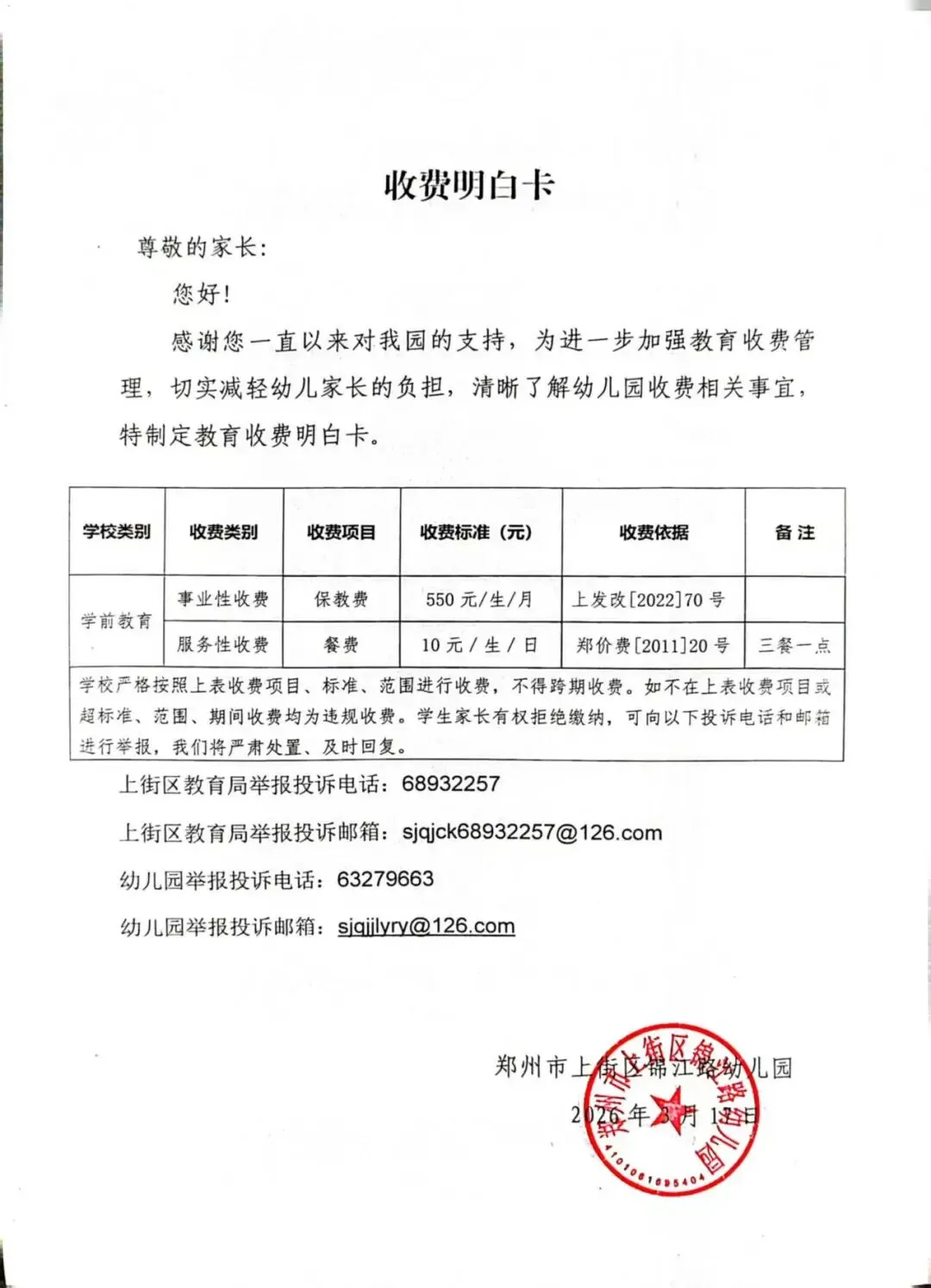 >郑州市上街区锦江路幼儿园收费明白卡