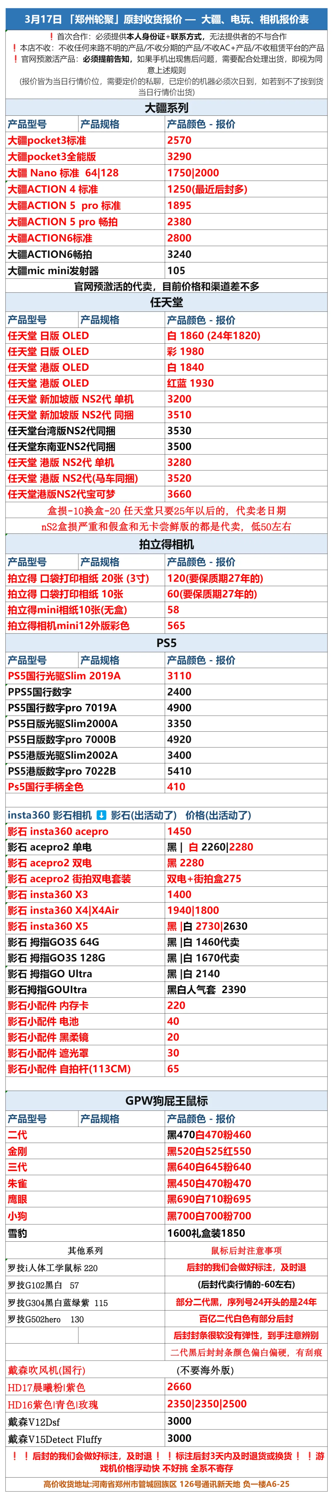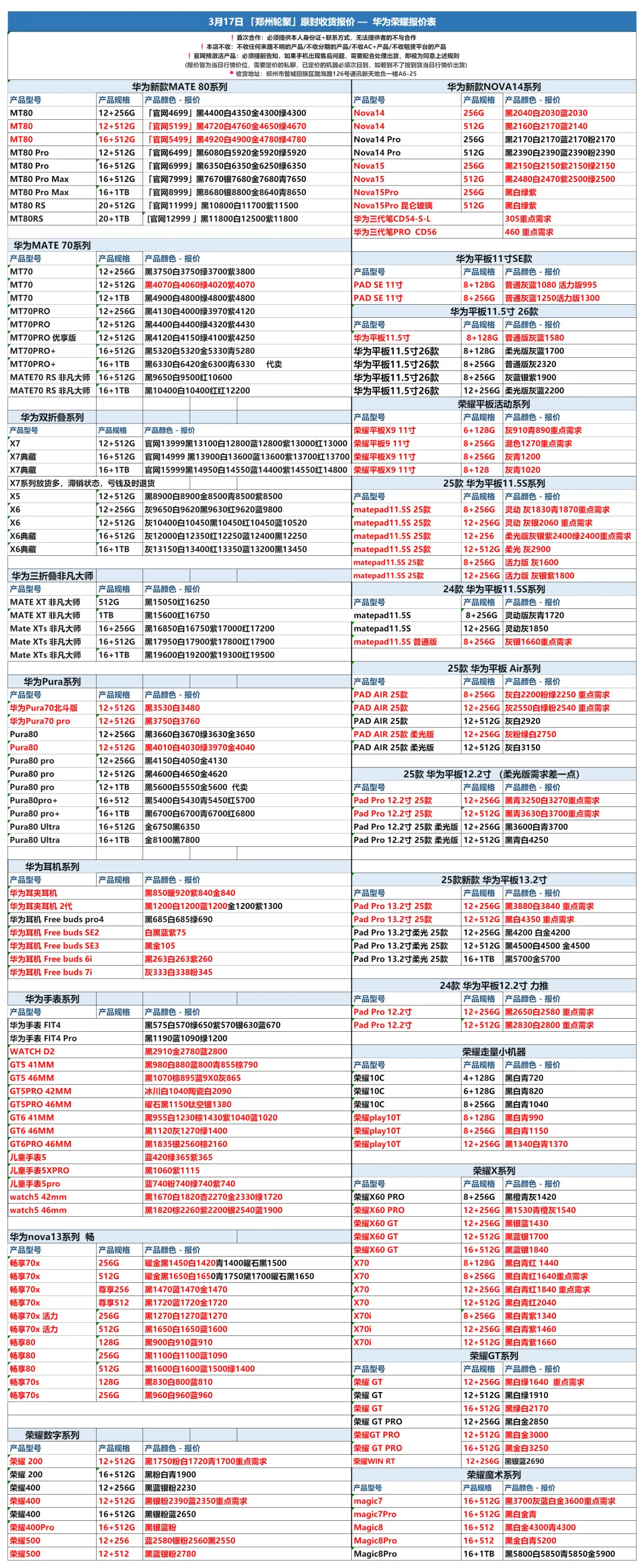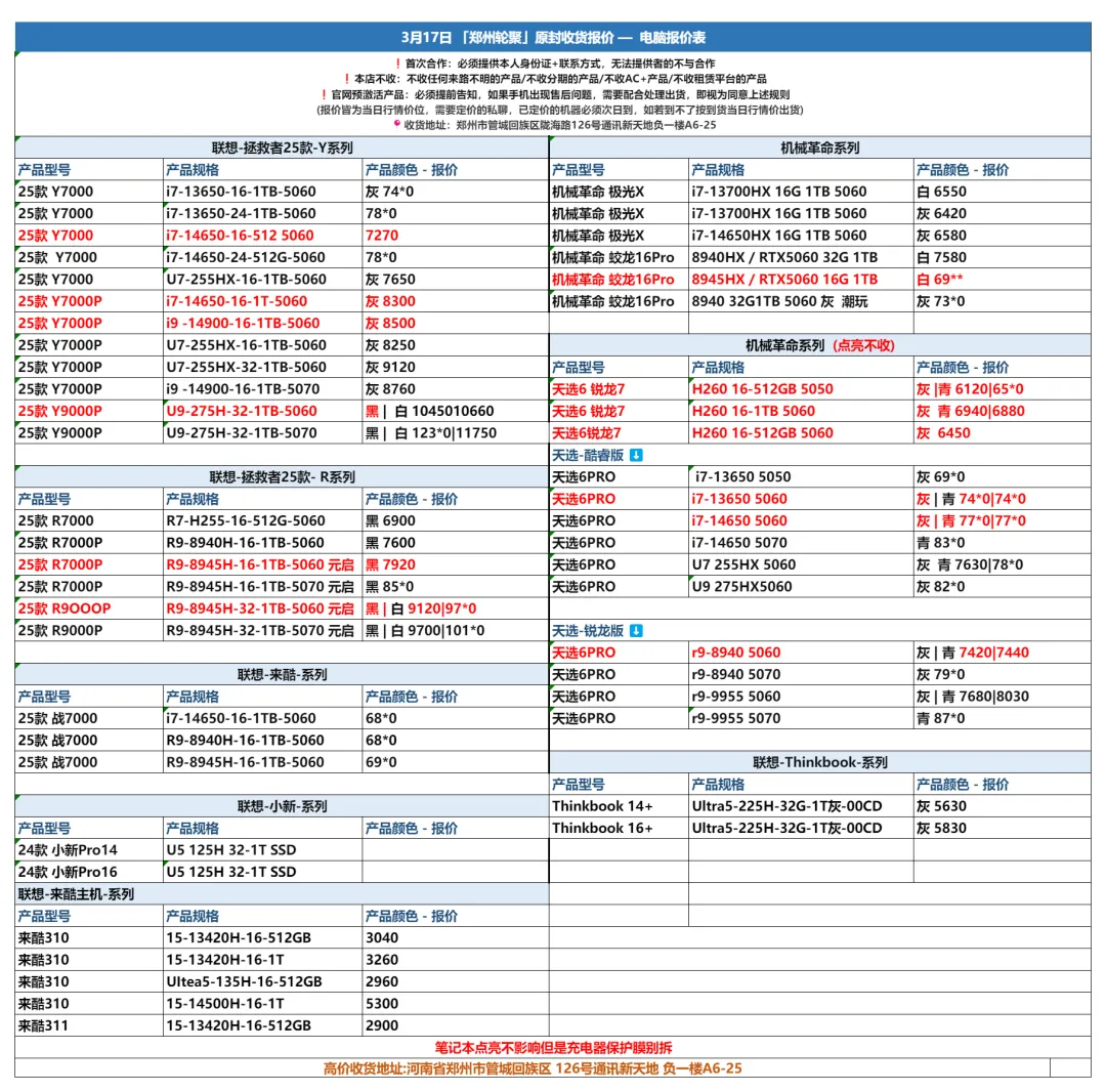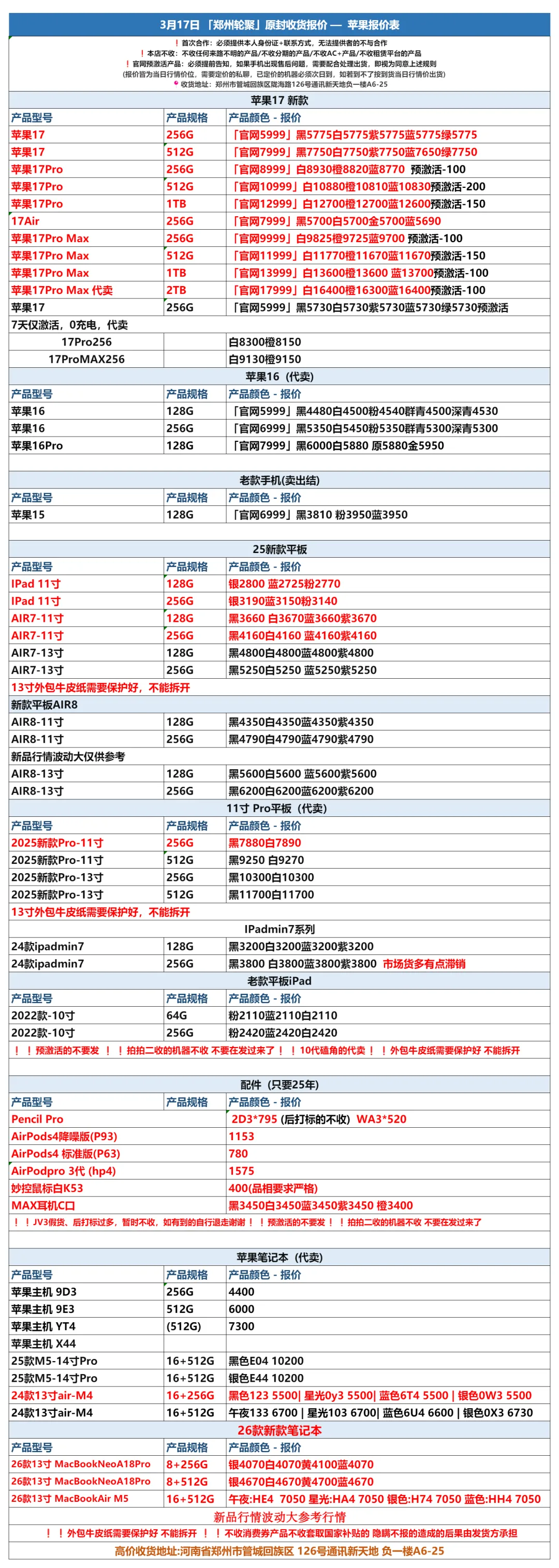 郑州轮聚通讯 2026年3.17日数码报价更新
