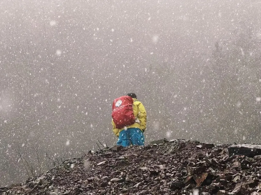 11点半,正式登顶,雪花取代了雨滴,借着风力恶狠狠的向我们袭来