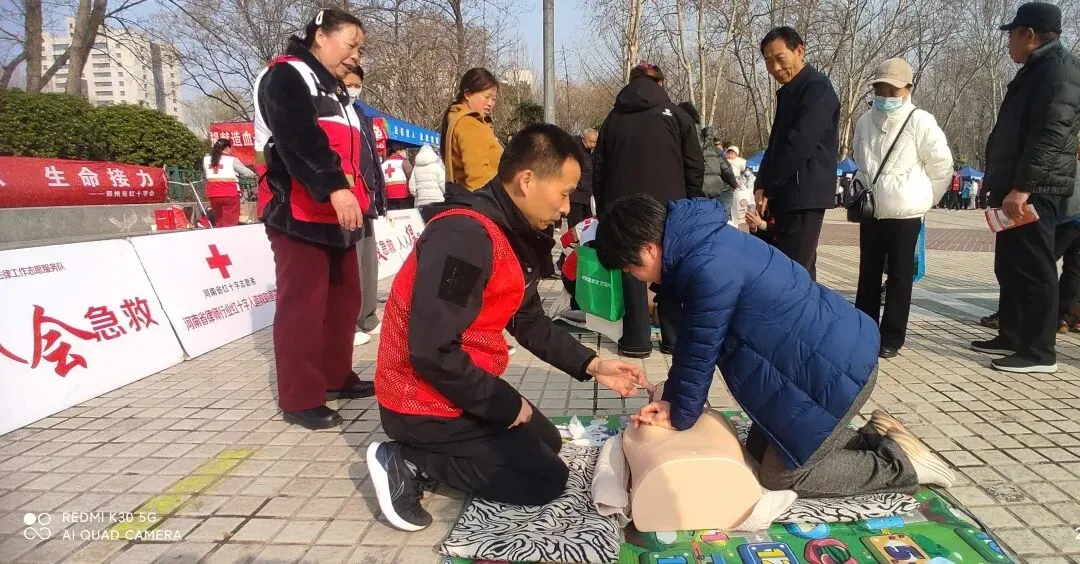 活动特别增设了“急救地摊”志愿服务环节。党员志愿者们搭建起简易急救服务台,带着急救包、心肺复苏模拟人等器材,现场开展急救知识普及,结合日常生活中常见的突发情况,手把手教群众掌握心肺复苏(CPR)急救实用技能。