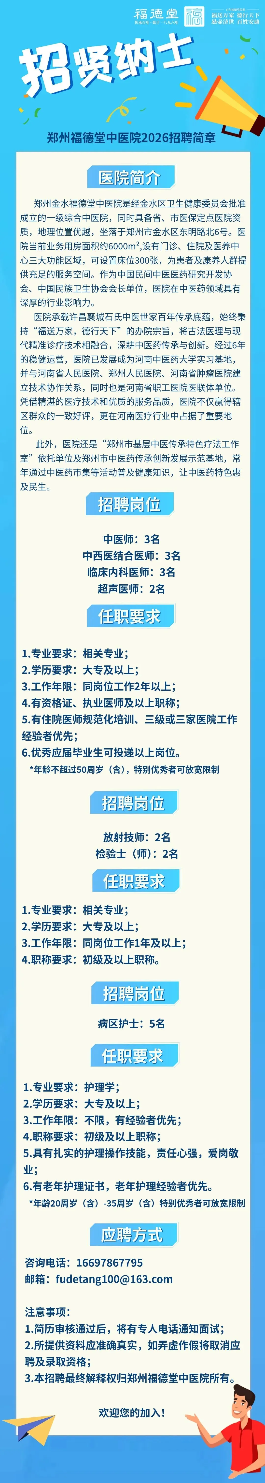 >郑州医院招聘,郑州金水福德堂中医院招聘工作人员