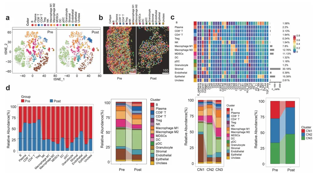 对接受 RD07 治疗前后的人类胃癌组织的空间分布情况进行免疫组化单细胞质谱分析(图源自Signal Transduction and Targeted Therapy )