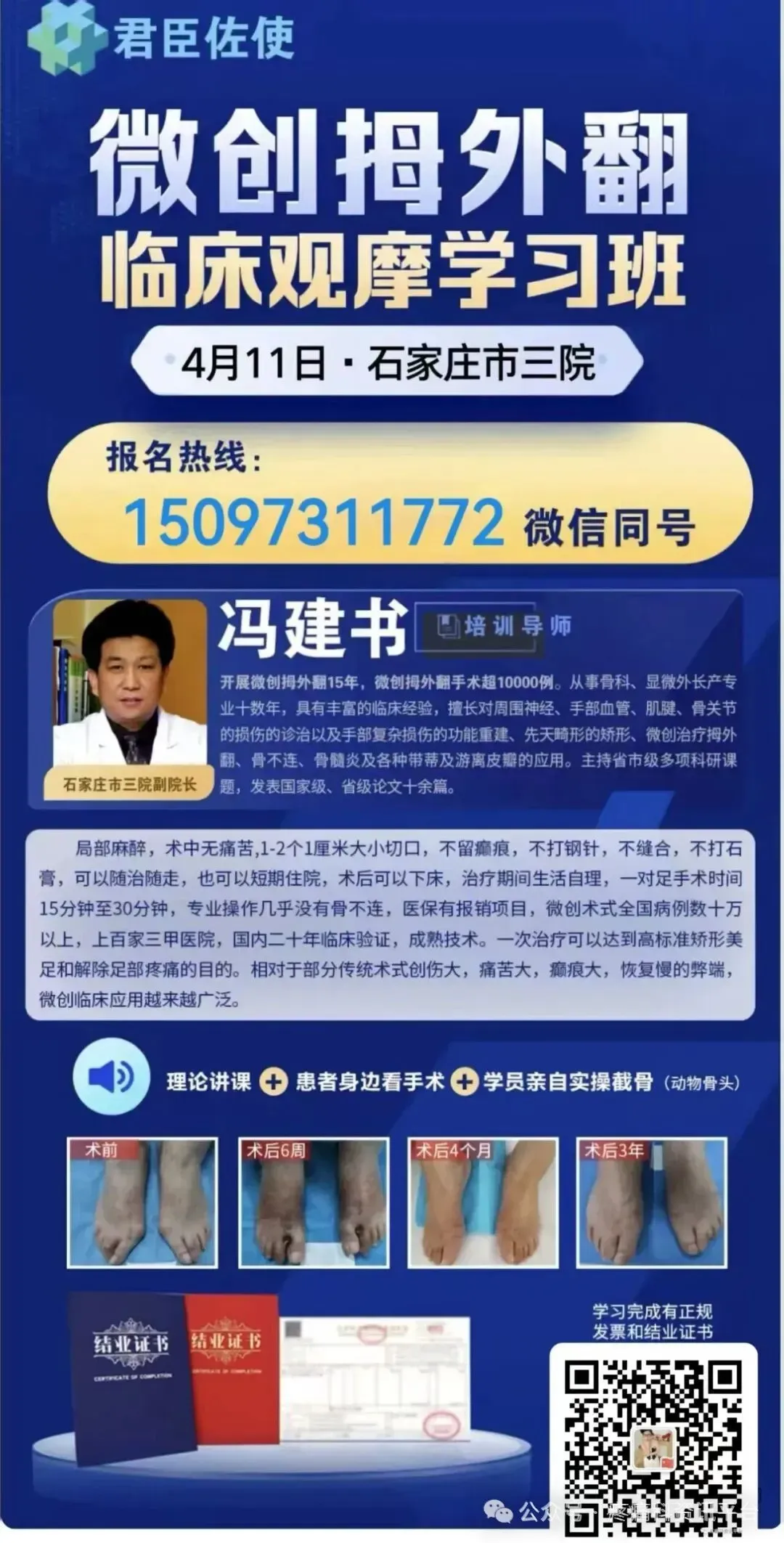 4月11日由原石家庄第三医院(石家庄市骨科医院)副院长冯建书主任担任主讲导师、石家庄君臣佐使会议服务有限公司主办的“第57期拇外翻微创临床观摩学习班”于2026年4月11日在石家庄市第三医院开办。4月11 日上午理论课程,下午分组进手术室临床观摩,晚上晚宴自愿参加(晚宴免费)一天学不会可以留在市三院多待几天,名额仅限10个,先报名的先给名额