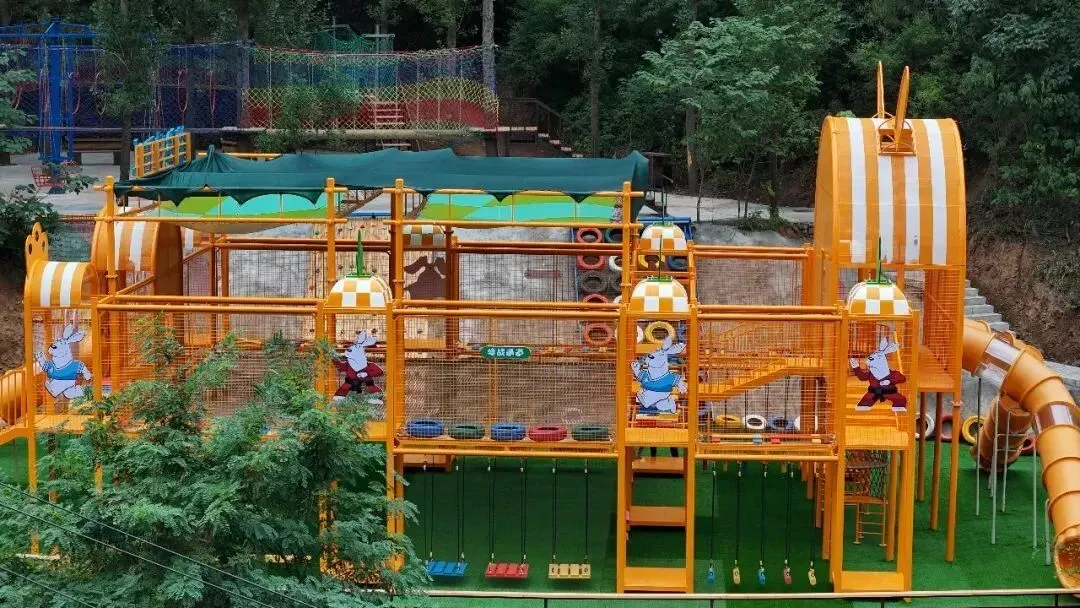 童趣森林是中原地区领先的山地森林儿童无动力乐园项目。其主要特点是不需要电力或其他外部能源驱动,完全依靠游客自身的力量进行互动和体验。童趣森林包括萌兔特工队、攀爬墙、摇摆锤、组合滑梯、攀爬架、秋千、蹦床等游乐设施,适合各个年龄段的孩子参与