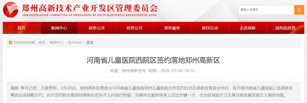 2月28日,郑州高新区管委会与河南省儿童医院郑州儿童医院合作签约仪式在高新区管委会举行,双方就河南省儿童医院入驻高新区事宜达成战略合作。
