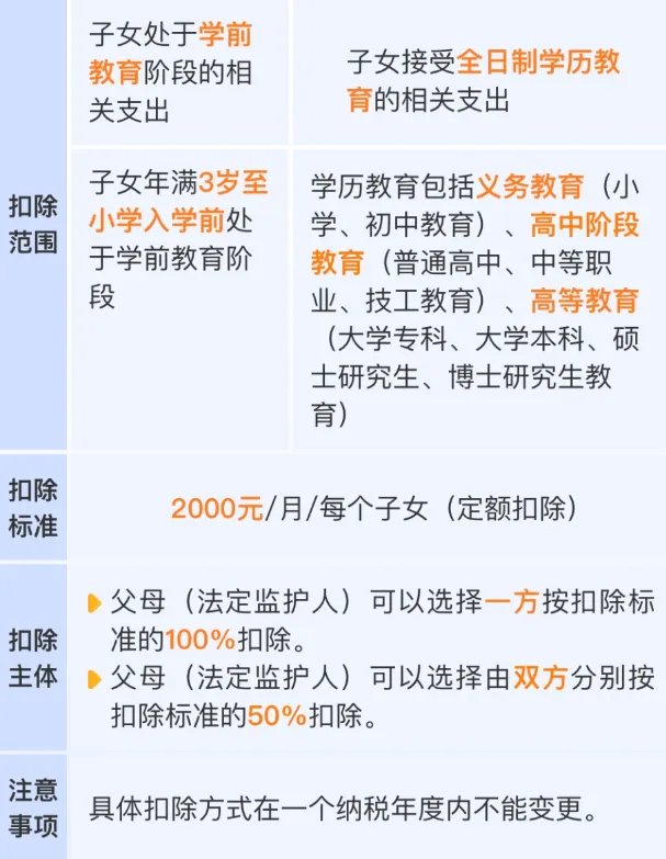 每个子女每月扣除2000元,适用于3岁以上子女接受全日制学历教育的支出;多个子女可累计扣除。