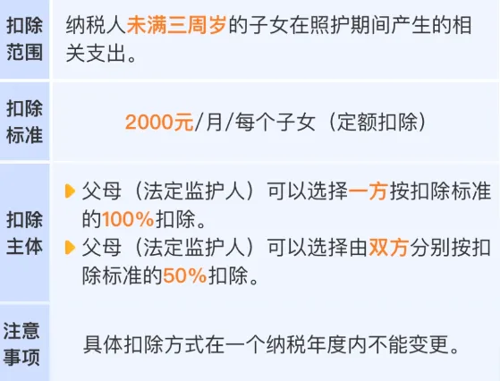 每个婴幼儿每月扣除2000元,用于支付婴幼儿照护的相关费用。多个婴幼儿可累计扣除。