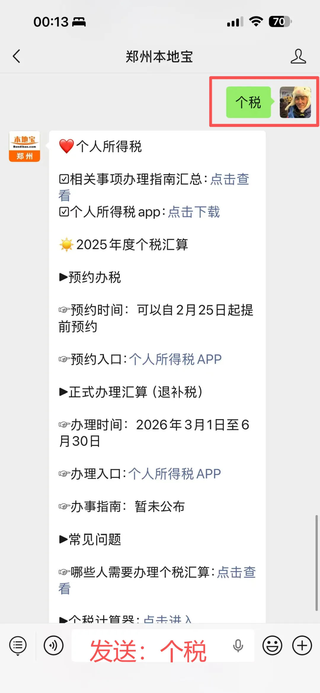 在聊天对话框回复【个税】