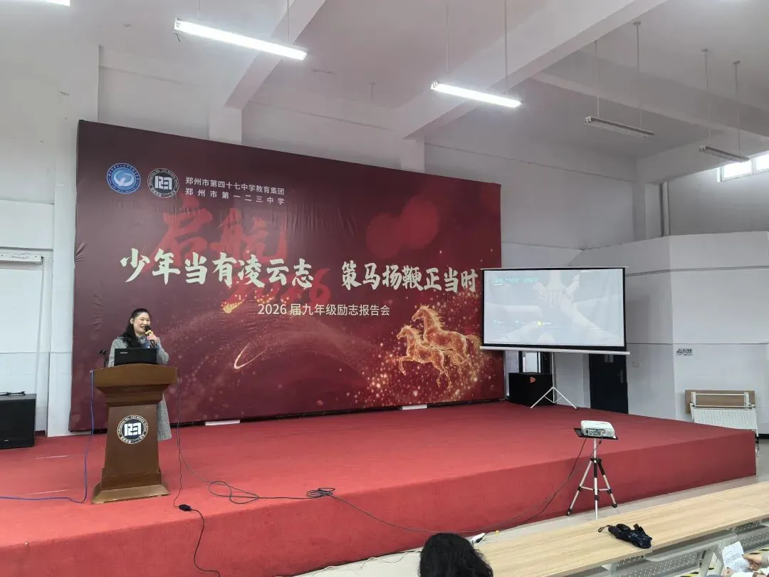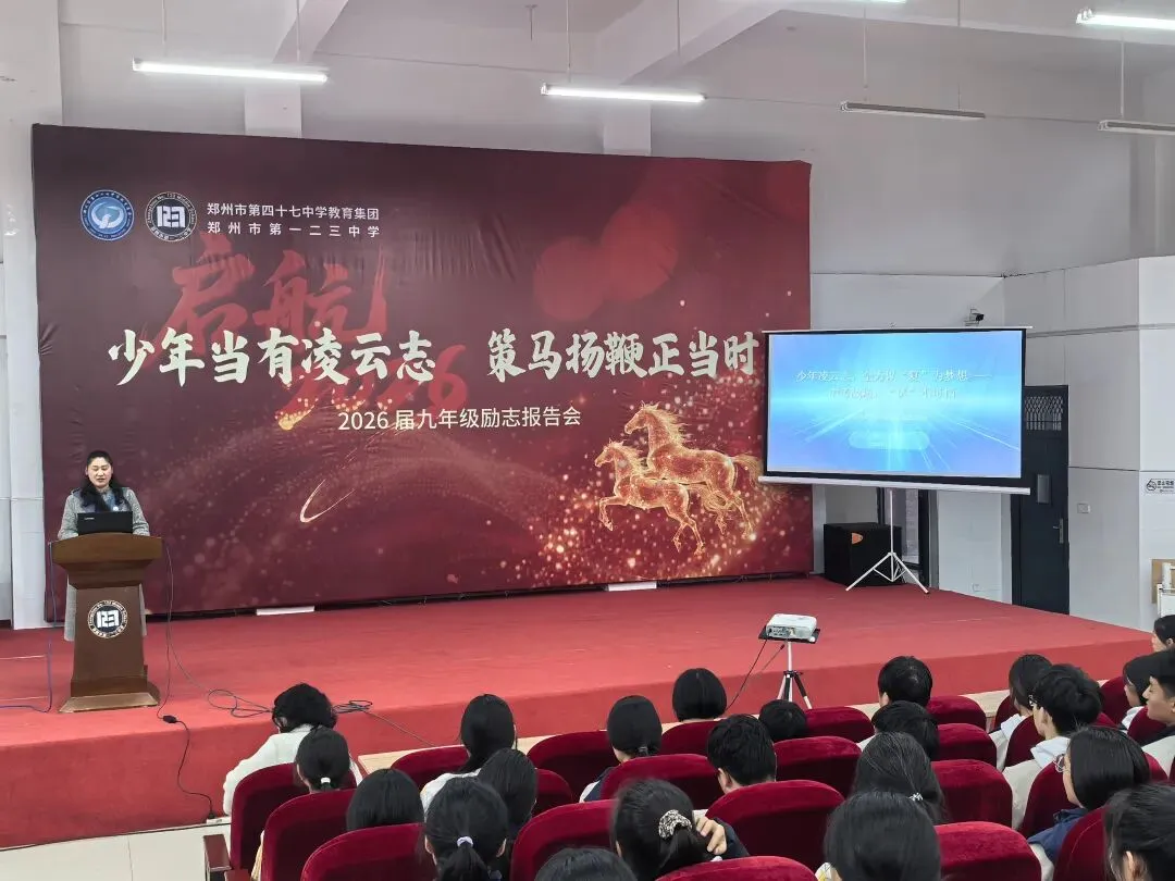 2026年3月17日,郑州市第一二三中学九年级学子齐聚一堂,召开“少年当有凌云志,策马扬鞭正当时“励志报告会。学校党支部书记、九年级心理健康教育教师祝俊红在本次报告会中,以“少年凌云志,全力以‘复’为梦想”为题,进行心理赋能,为学子们拆解焦虑,凝聚信念,为学子们的复习备考筑牢心理防线。
