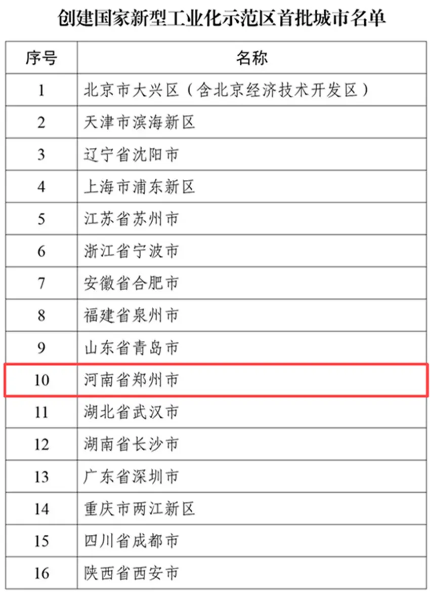 工业和信息化部确定首批16个创建国家新型工业化示范区城市,郑州市入围。创建城市要对照创建期工作目标,优化创建工作方案,强化组织保障,完善政策措施,确保各项示范任务落实落细。