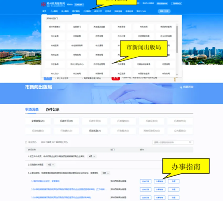 郑州市新闻出版局政务服务事项现已全面开通网上办理渠道,出版物经营许可证(批发类)和印刷经营许可证两类证件可全流程网上申办,办理问题可现场咨询或电话67185300咨询。