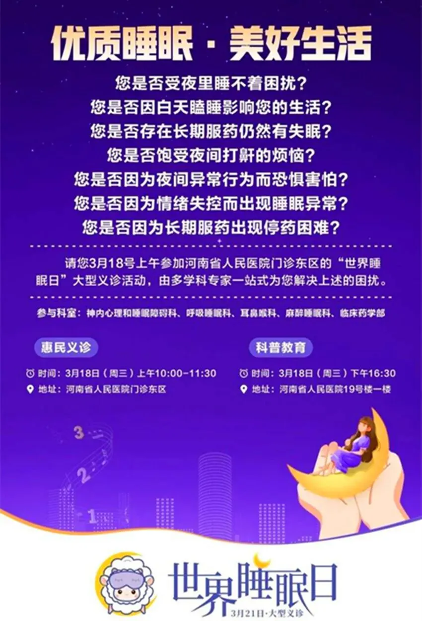 3月21日是第26个“世界睡眠日”。今天,河南省人民医院心理医学科、神内睡眠障碍科、呼吸睡眠科、耳鼻喉科、麻醉治疗科、临床药学部等6个科室将联合举办大型科普教育活动。