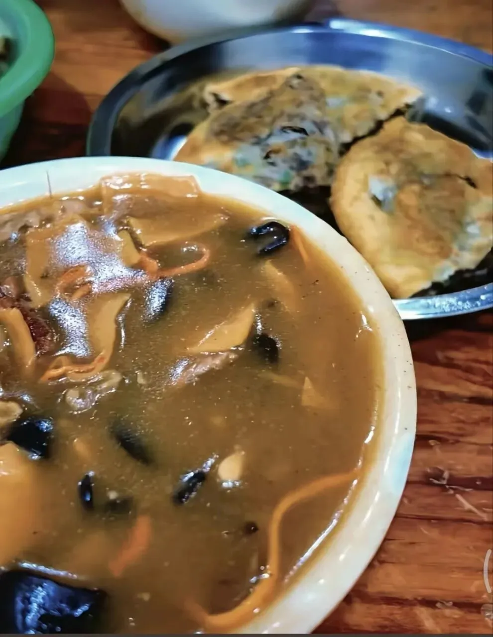他家的胡辣汤料很足,里面有大块的牛肉、多种菌菇(如鹿茸菌)、木耳和粉条等,口感丰富。牛肉炖得软烂,汤底浓郁,喝一口浑身都暖乎乎的。主食有:肉盒,葱花油饼、水煎包和小油条也都是热门选择,可以根据喜好搭配。