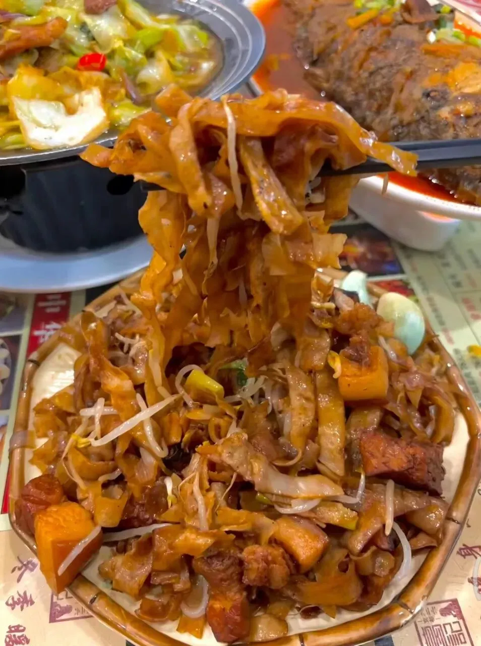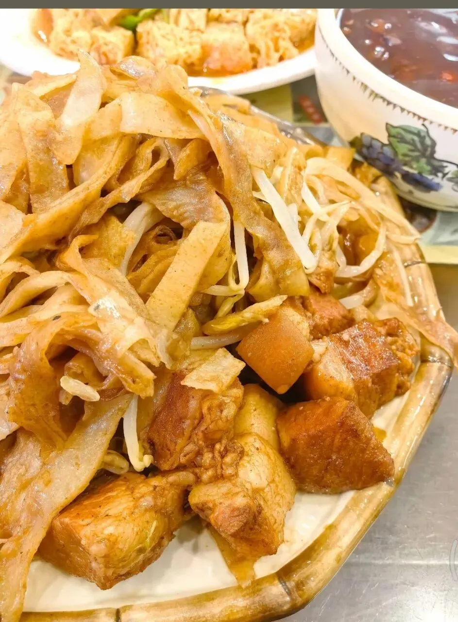 坛子肉焖饼,这是店里的灵魂招牌。五花肉炖得软烂,酱汁浓郁,每一根饼丝都吸满了肉香,油润而不腻。