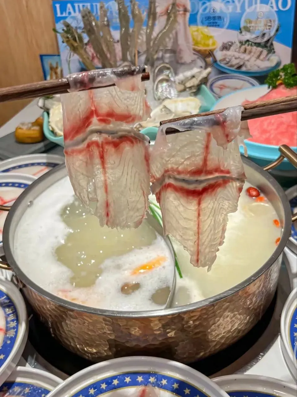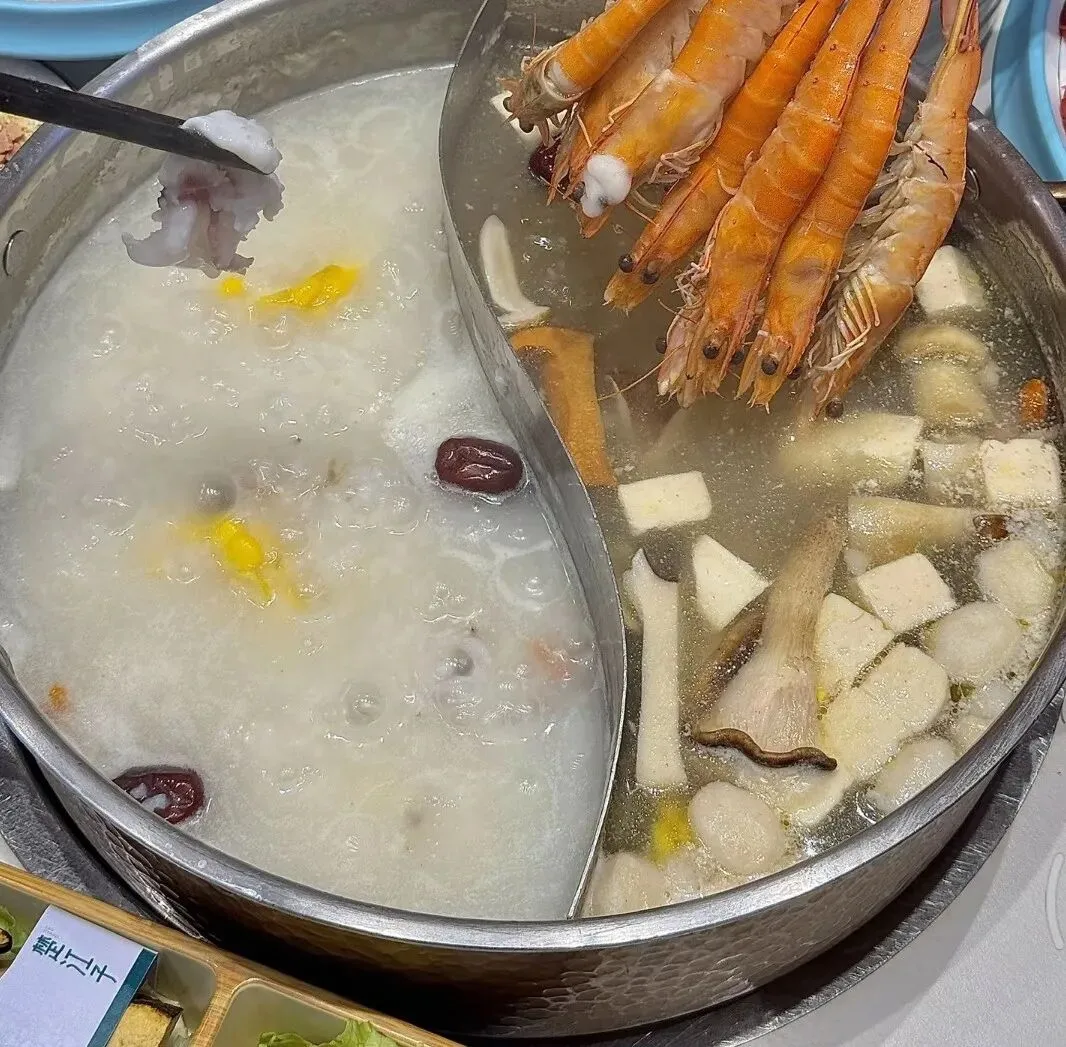 双拼锅底:一边是鲜浓斑鱼汤,一边是现熬五常米+糯米+鱼骨的粥底,鲜到掉眉毛 。
