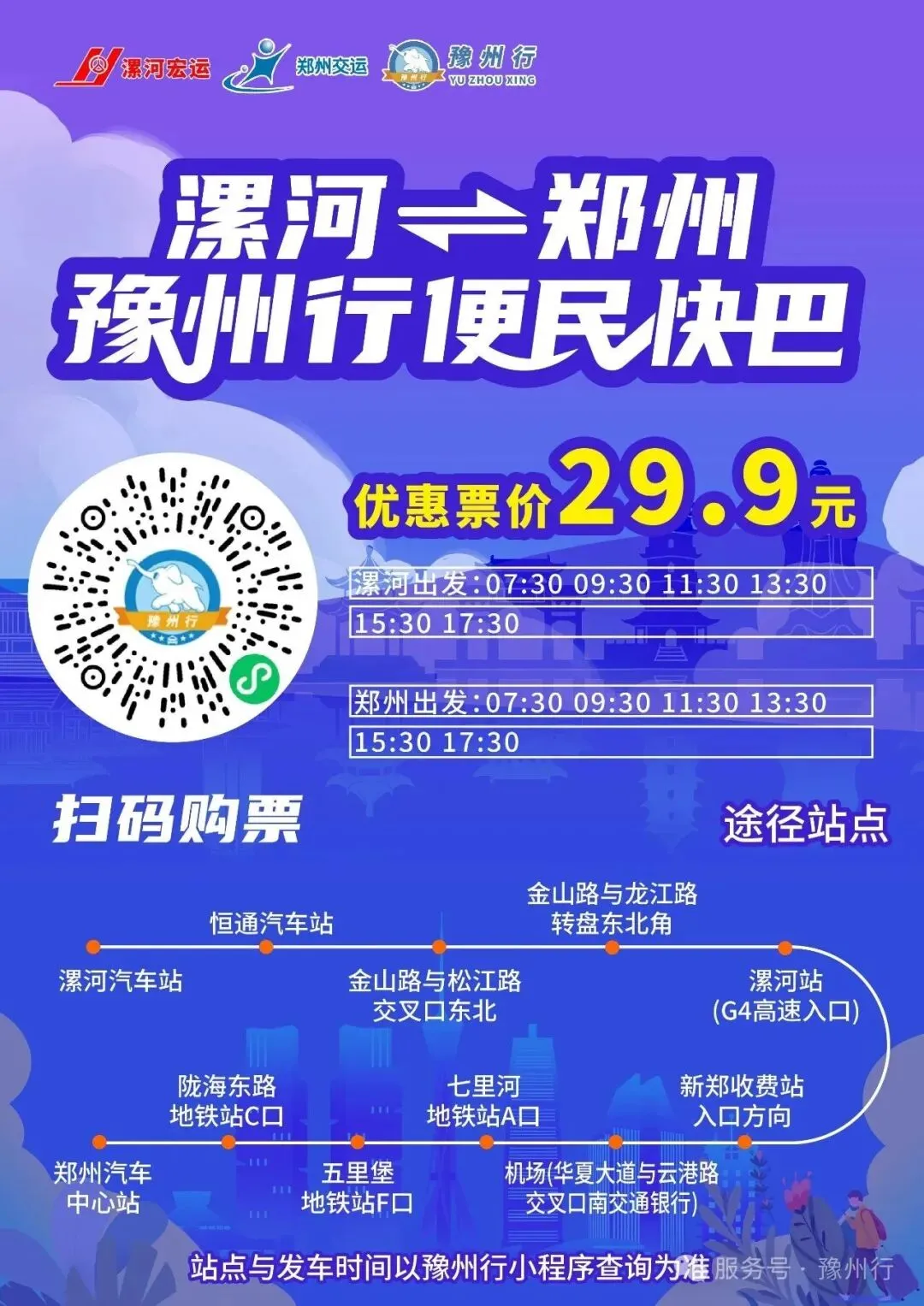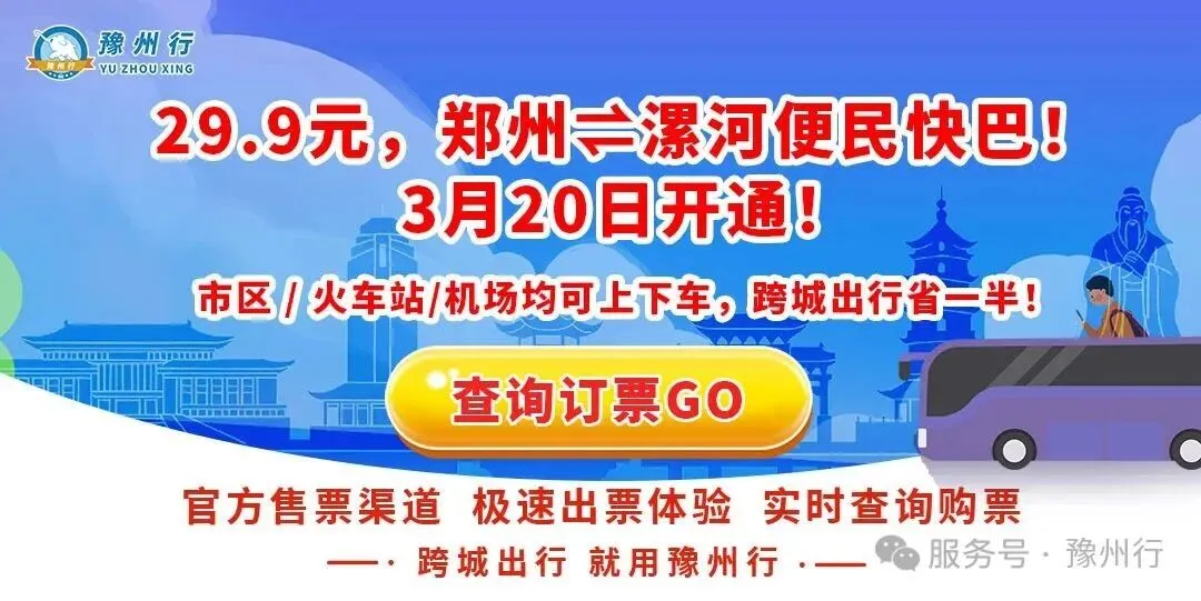 重点记牢!3月20日,郑州⇌漯河豫州行便民快巴正式开通,当天起按固定班次双向对发,当天就能购票乘车,彻底解决郑漯两地往返不便的痛点。