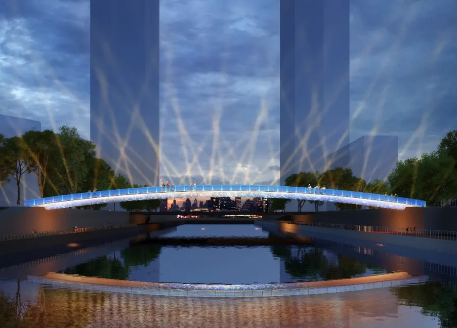 北运河人行桥:位于内环滨河步道与北运河交接处,为钢箱梁坦拱桥,连接运河东西两侧公共文化用地,全长85米,桥宽同样8米。