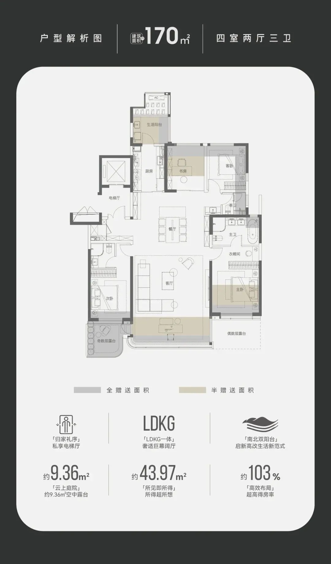 通派龙湖御潮云上170㎡是当红户型,176㎡的户型走进去像250㎡,全景舱设计,空间感炸裂。如果你非常看重“大空间”,想拿面积做文章,选御潮云上。