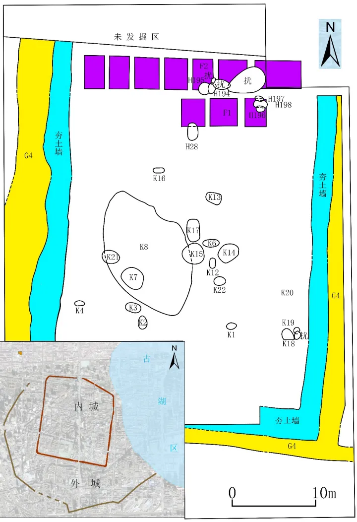一处位于内城外西北部,为环壕与夯土墙合围的长方形大型祭祀区,东西宽约30米、南北长逾50米。中部设核心祭祀场,周围密集分布数十个祭祀坑,出土人骨、动物骨骼、卜骨、石刀等,祭祀区北部有成排夯土建筑基址。有学者认为,该遗存与文献记载的“庙、社、坛、坎”等祭祀形态密切相关。